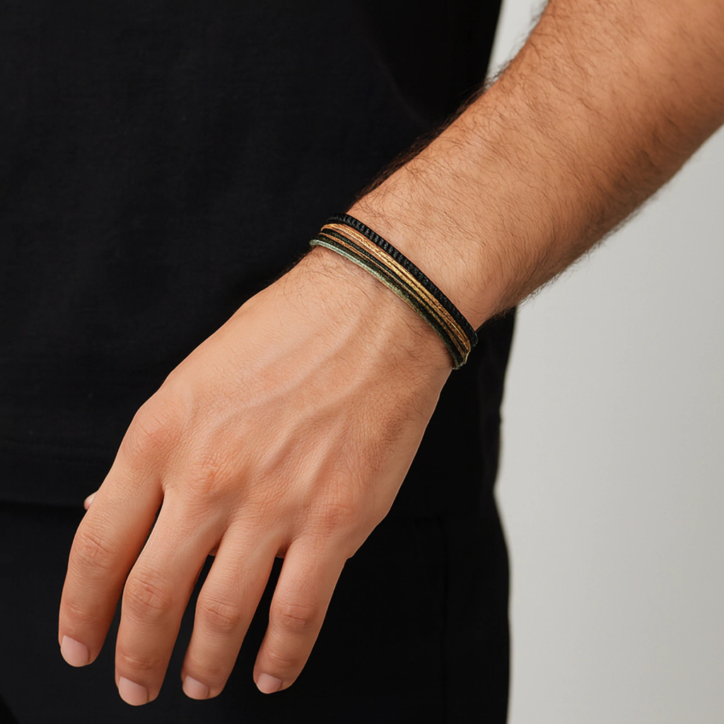 Pulsera hecha con hilo vibora color verde, beige y negro
