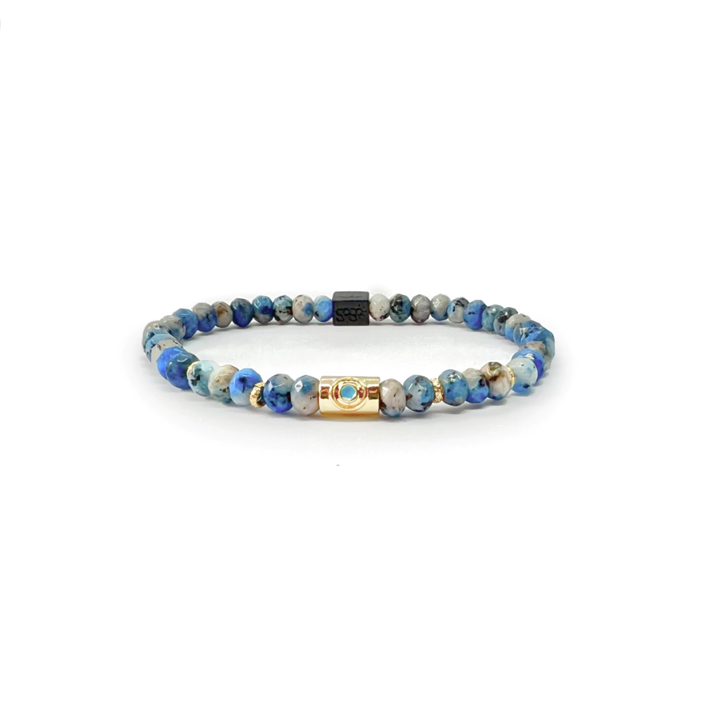 Pulsera diseñada en rocas facetadas de 6mm en forma de dona y combinada con arandelas y dije central en oro golfi, este dije central es cilíndrico con un ojo turco en el centro de color celeste.